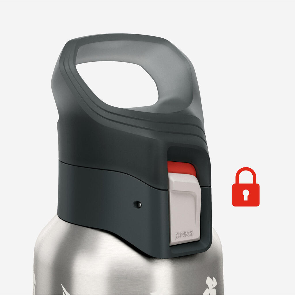Le bouchon s'ouvre facilement à une main en appuyant sur le bouton blanc à l'endroit marqué "PRESS". Lors du transport il est possible de verrouiller ce bouton en glissant le bouton blanc vers le bas. Un espace rouge apparaît alors indiquant que le bouchon est verrouillé et il n'est plus possible d'appuyer.