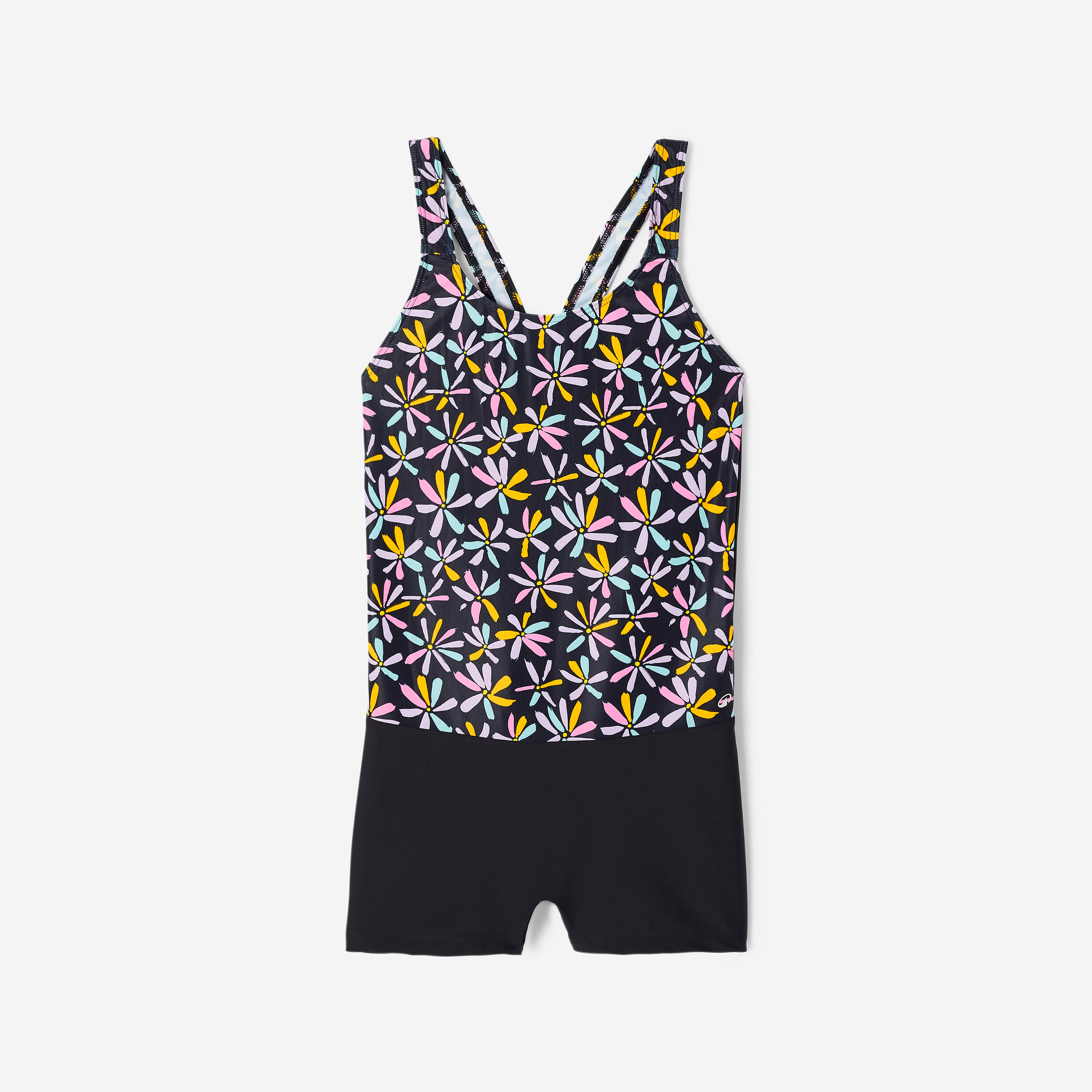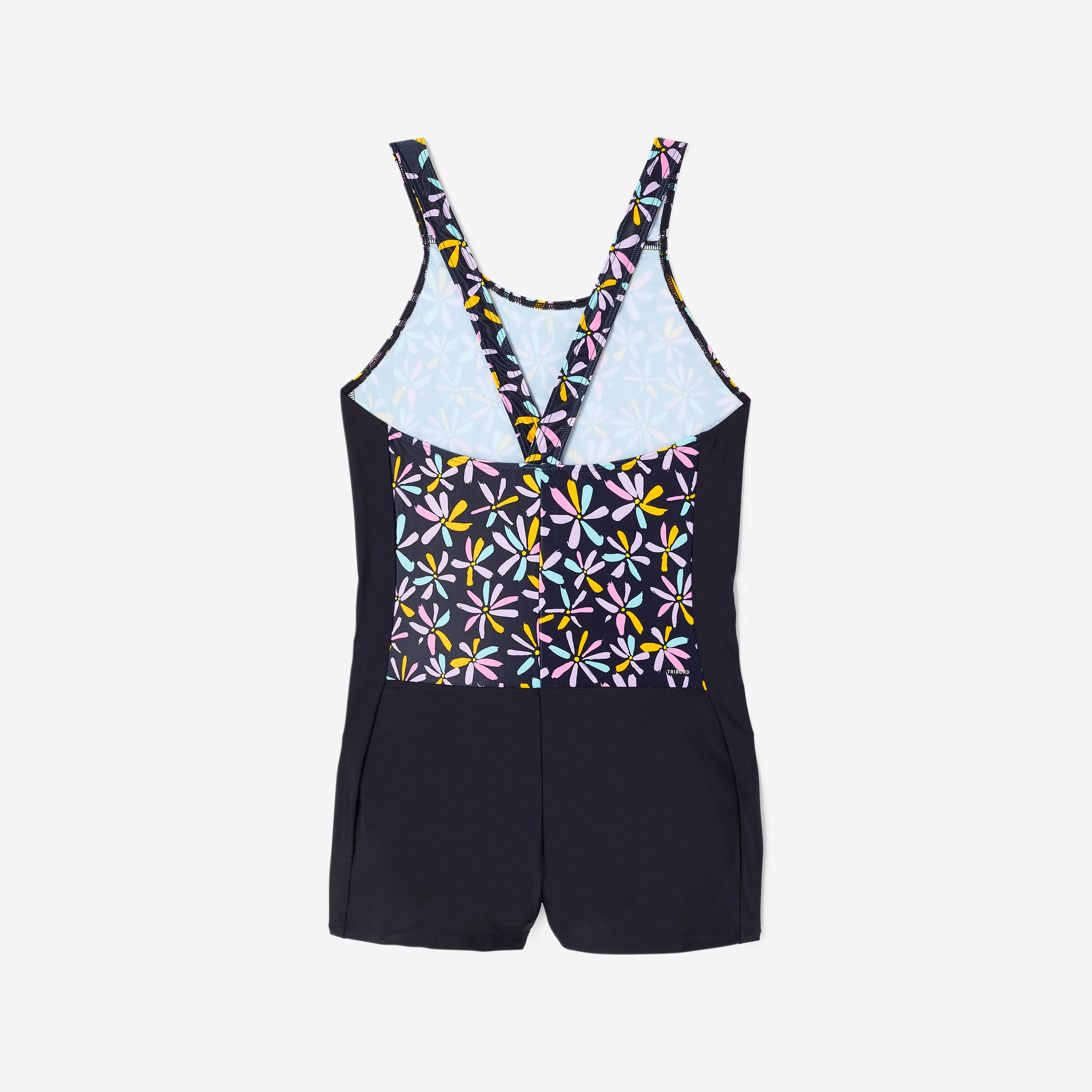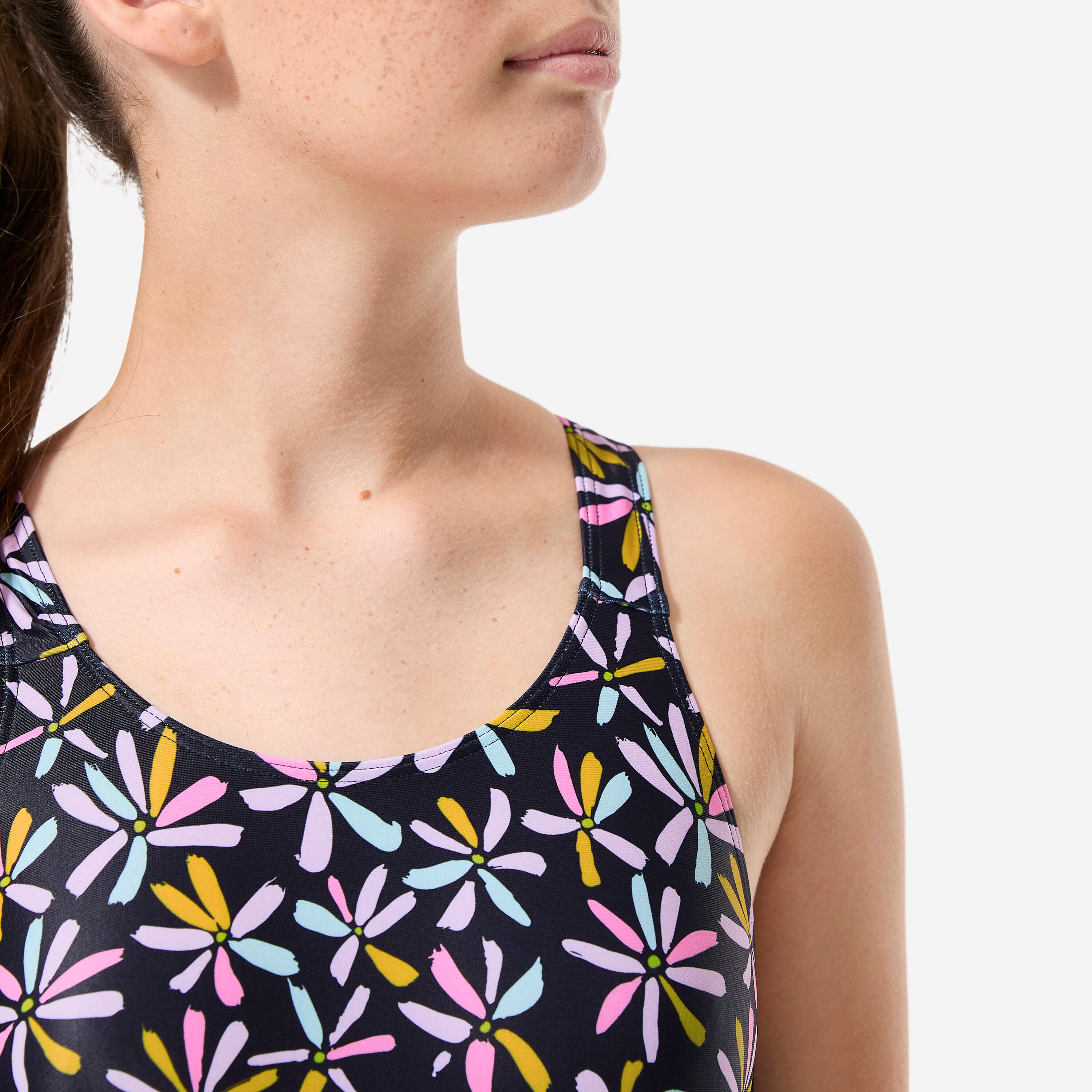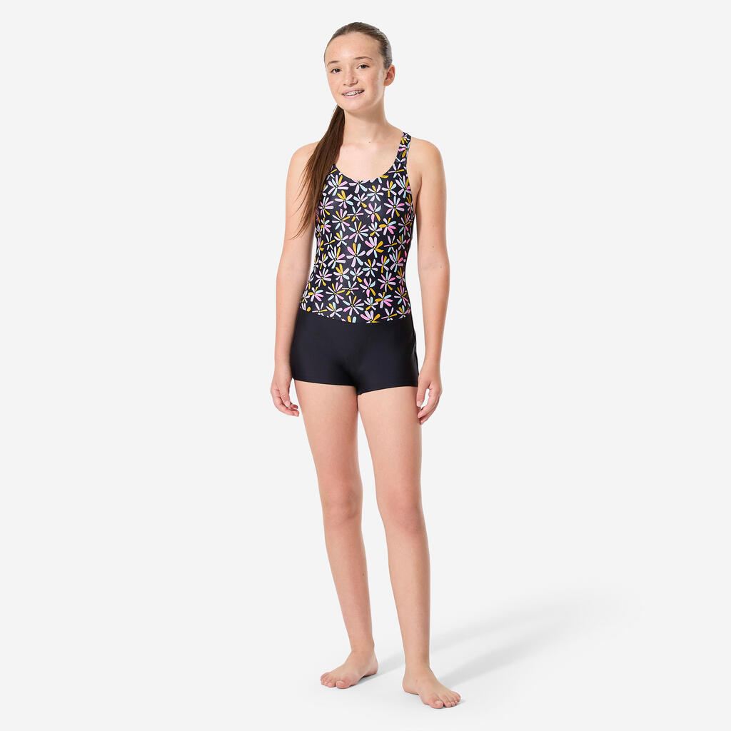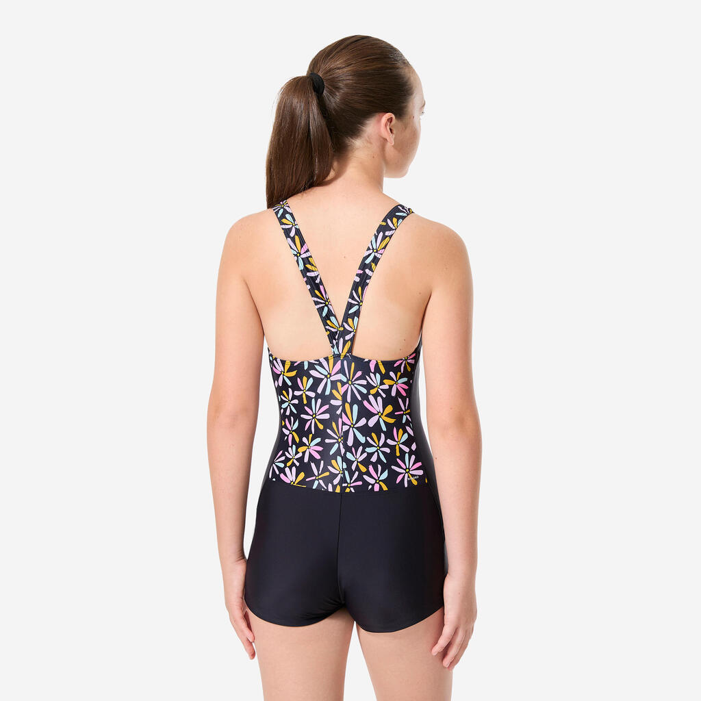 Couvrant et stable, ce maillot de bain 1 pièce de natation pour fille et adolescente a une forme shorty, un dos en V et des bretelles larges.