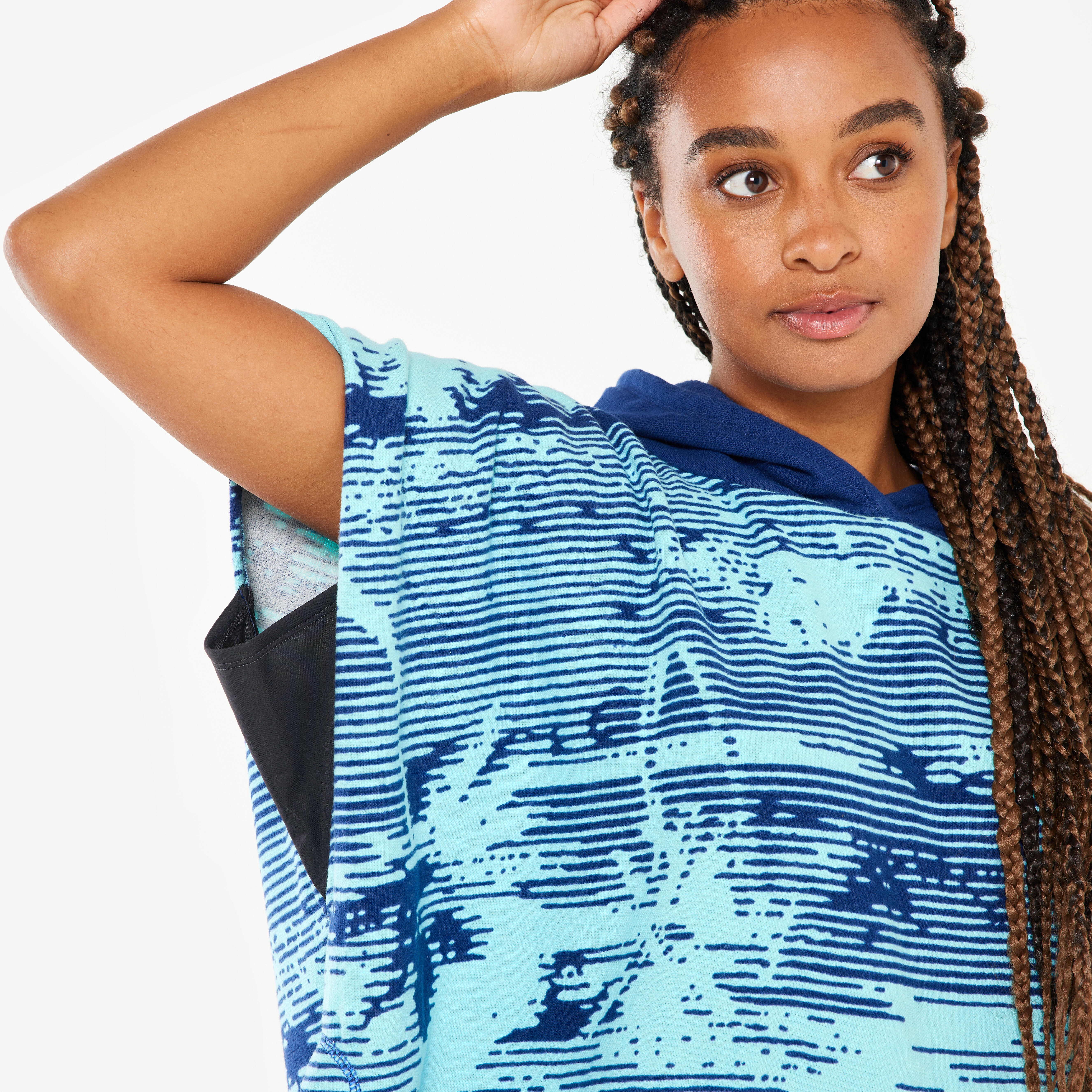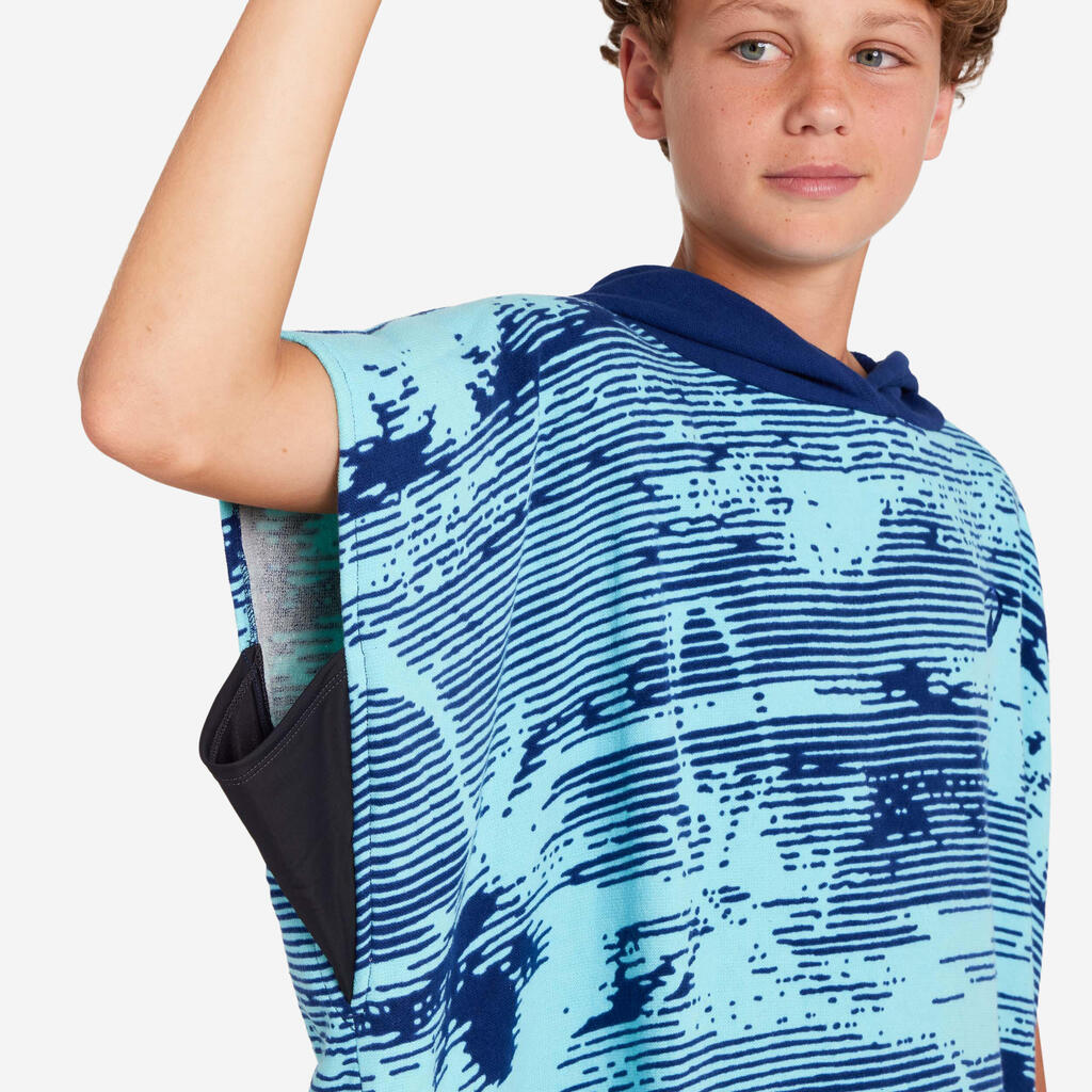 Ce poncho de surf permet aux jeunes de 135 à 160 cm de se sécher. Ses empiècements extensibles sous les bras et ses ouvertures latérales facilitent le change en assurant une protection totale.